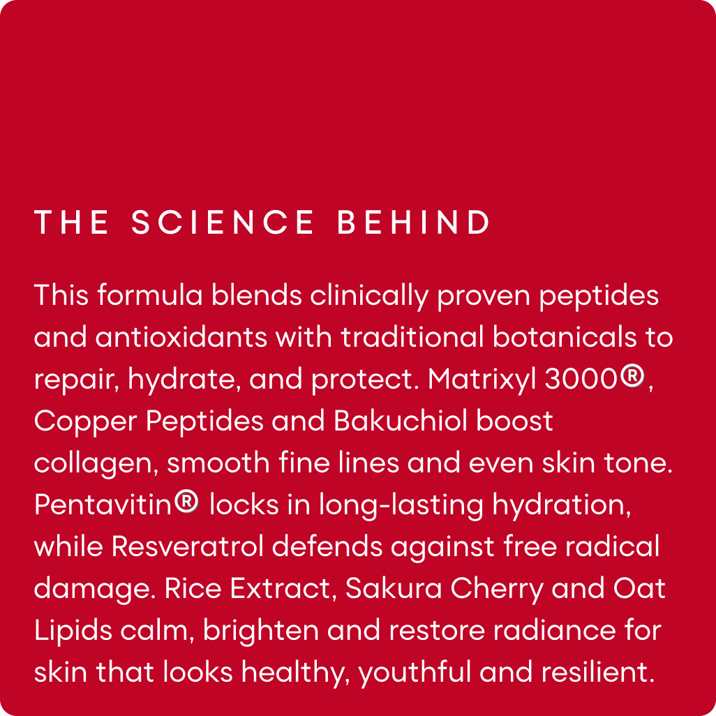 Matrixyl 3000®, Copper Peptide, Bakuchiol, Resveratrol, Sakura Cherry Extract, Rice Extract, Oat Lipids, Ceramides, Squalane, Pentavitin®, Hyaluronic acid